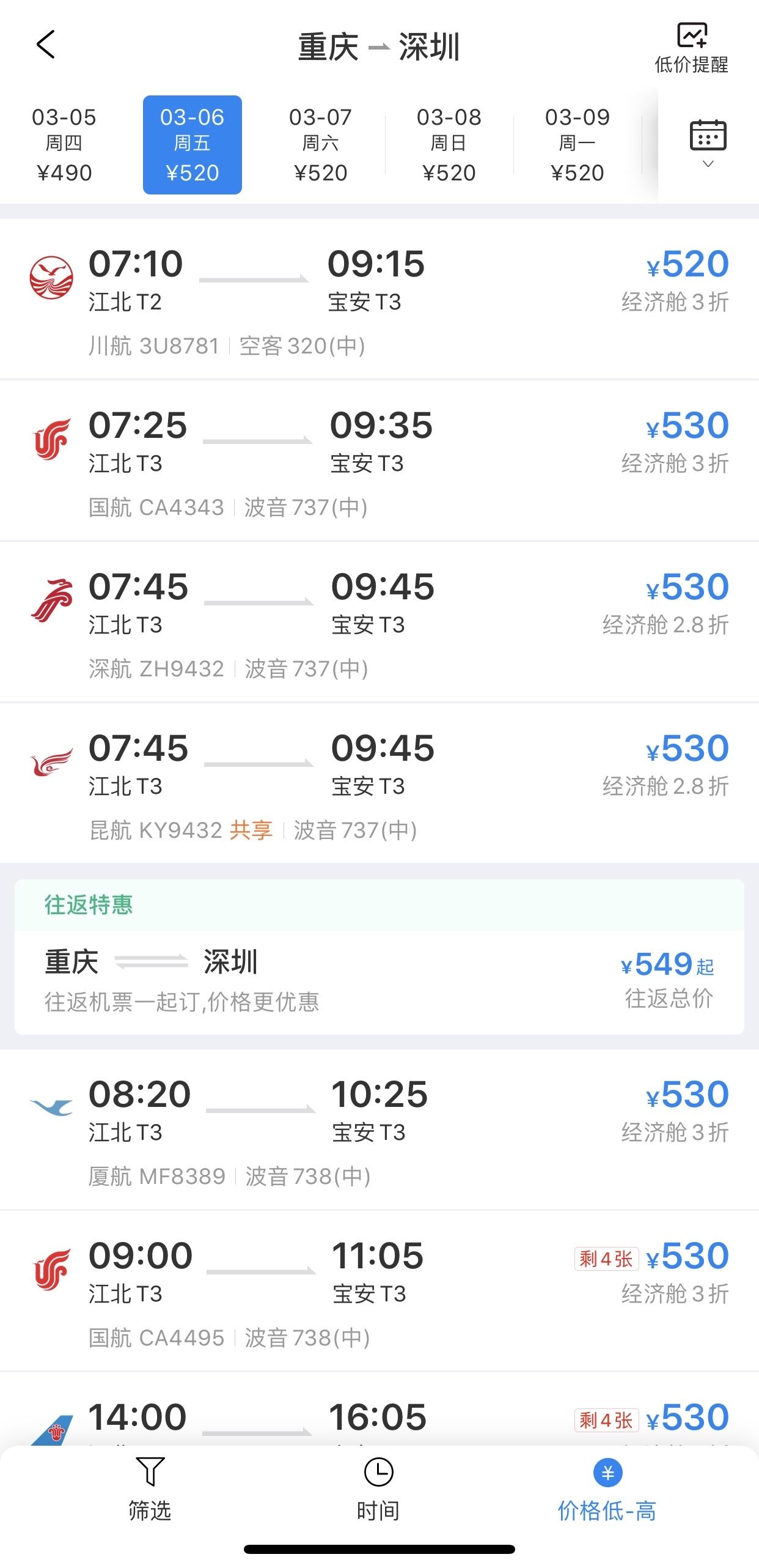 記者留意到,這些低價機票基本是某一航線從深圳出發(fā)的單程情況,而其返程回深的票價則要高出許多,如從重慶、成都、鄭州、西安等地飛深圳的大部分航線,其3月的票價為500多元。