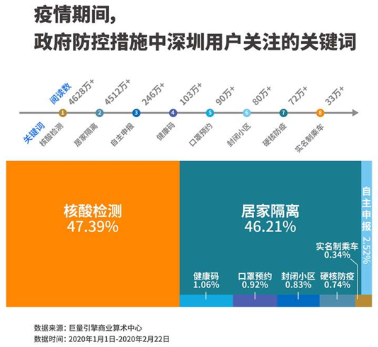 深圳市的具體防控舉措也被今日頭條深圳區(qū)域用戶高頻關(guān)注。數(shù)據(jù)顯示,免費(fèi)的核酸檢測關(guān)注度排名第一,閱讀數(shù)達(dá)到4628萬次。為了防范病毒的社區(qū)傳播,2月12日起,深圳市對(duì)于居家隔離觀察人員全面展開了病毒免費(fèi)合作檢測工作。隔離者的確定集合了街道的逐戶排查和住戶的自主申報(bào),結(jié)合住戶的行程軌跡,最大程度避免遺漏。