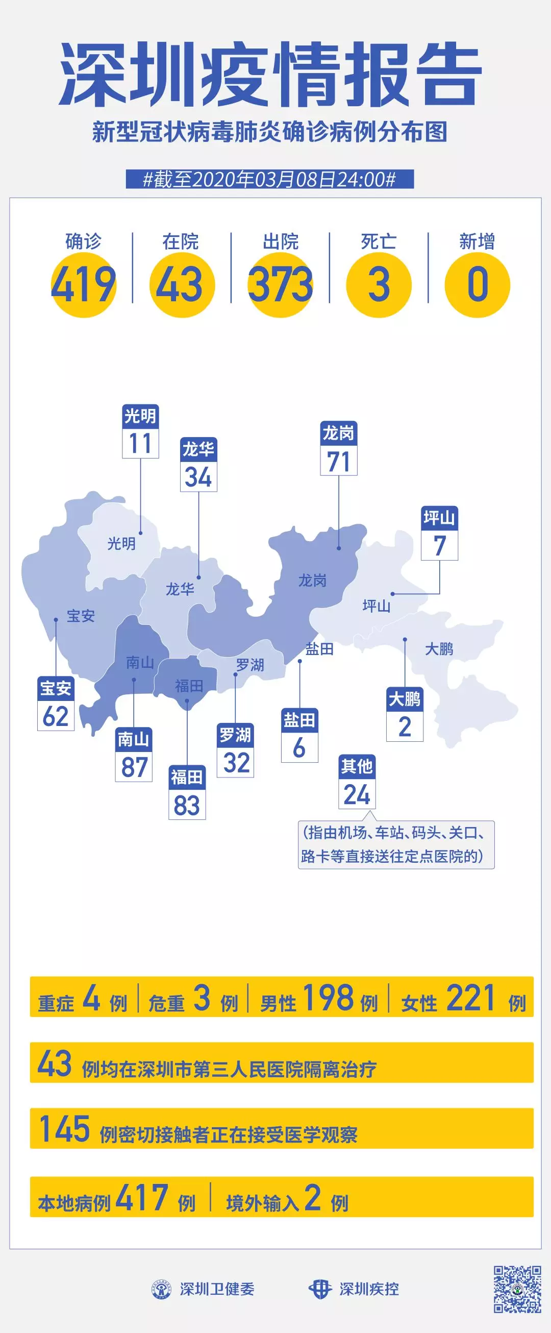 截至3月8日24時(shí),深圳累計(jì)報(bào)告“新冠肺炎”確診病例419例。3月8日當(dāng)天全市無新增確診病例,當(dāng)天出院病例5例(從2月26日起不再公布出院個(gè)案)。