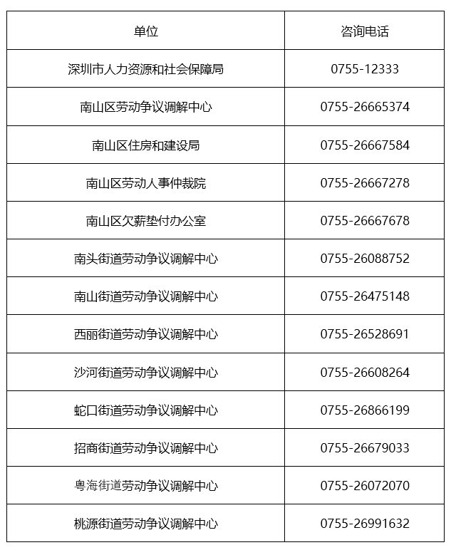 企業(yè)和職工均可致電深圳市南山區(qū)人力資源局(電話:26576148),咨詢用工過程中出現(xiàn)的問題,區(qū)人力資源局將竭誠指導服務。也可以按需求、分片區(qū),通過以下方式尋求幫助: