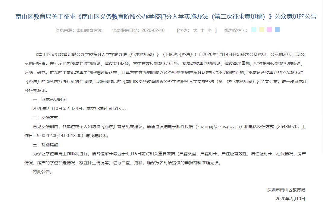 1月19日,南山區(qū)教育局第一次征求意見發(fā)出后,共收集到關(guān)于積分算法調(diào)整的反饋意見182條,并于2月10日第二次發(fā)布《南山區(qū)義務(wù)教育階段公布學(xué)校積分入學(xué)實(shí)施辦法》征求意見稿(以下簡(jiǎn)稱《意見》),根據(jù)《意見》內(nèi)容,擬調(diào)整2020年積分入學(xué)辦法。
