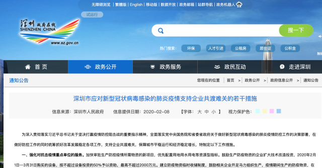 深圳發(fā)布《深圳市應(yīng)對新型冠狀病毒感染的肺炎疫情支持企業(yè)共渡難關(guān)的若干措施》