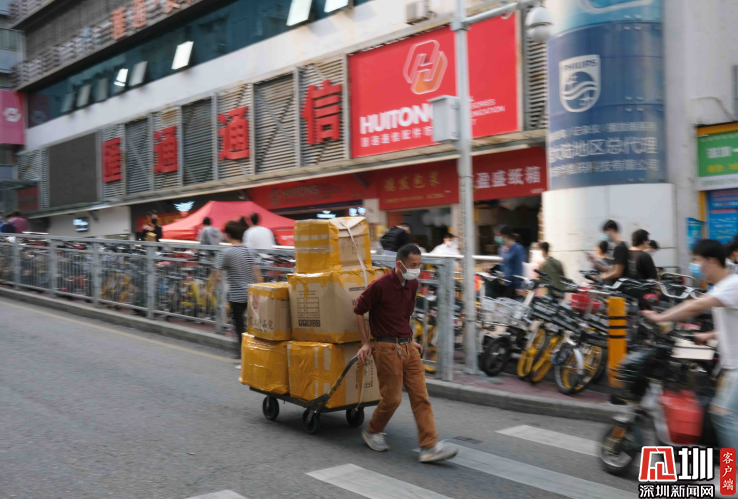 華強(qiáng)北商圈,一位正在運(yùn)送貨物的人。
