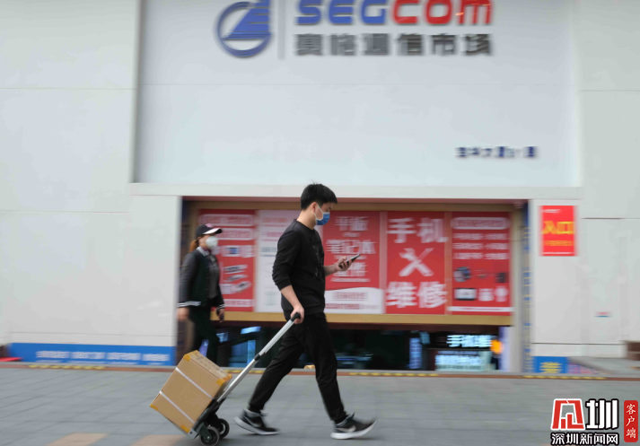 3月16日下午,賽格通訊市場(chǎng)門口,一名拉著小推車的人經(jīng)過。
