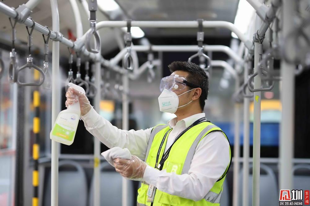 工作人員對(duì)機(jī)場(chǎng)擺渡車(chē)進(jìn)行消殺。