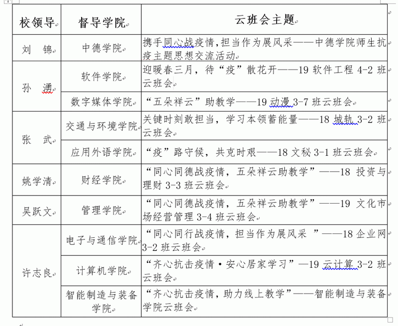 深圳信息學院校領(lǐng)導參加“云班會”安排表。