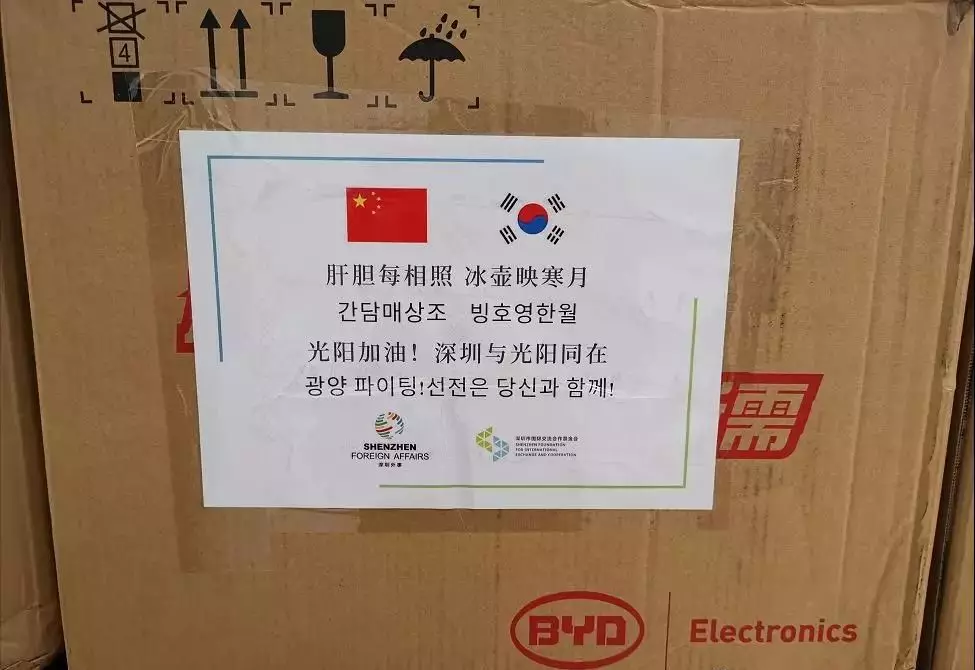 在韓國光陽寄來深圳的物資箱上,寫著“心相通,民相親,天涯咫尺間”。而在深圳此次寄出的物資箱上,也深情引用了韓國詩人許筠的一句詩:“肝膽每相照,冰壺映寒月?!?/p>