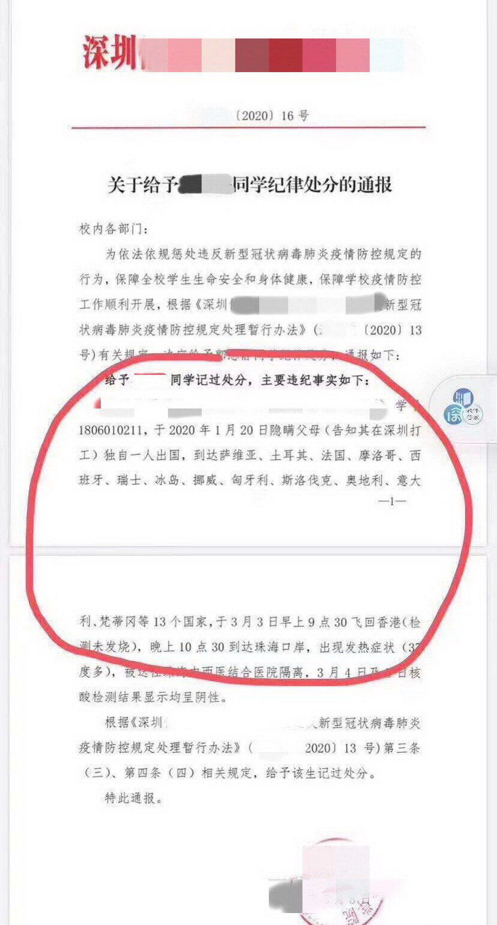 見圳客戶端·深圳新聞網(wǎng)2020年3月20日訊 近日,一位深圳女大學(xué)生小Y瞞著父母出游13國,回國后因發(fā)熱被隔離并因未如實向?qū)W校匯報行程被處分,此事引發(fā)社會關(guān)注。3月18日,當(dāng)事人接受深圳新聞網(wǎng)記者采訪,詳述事件經(jīng)過并表達悔意。