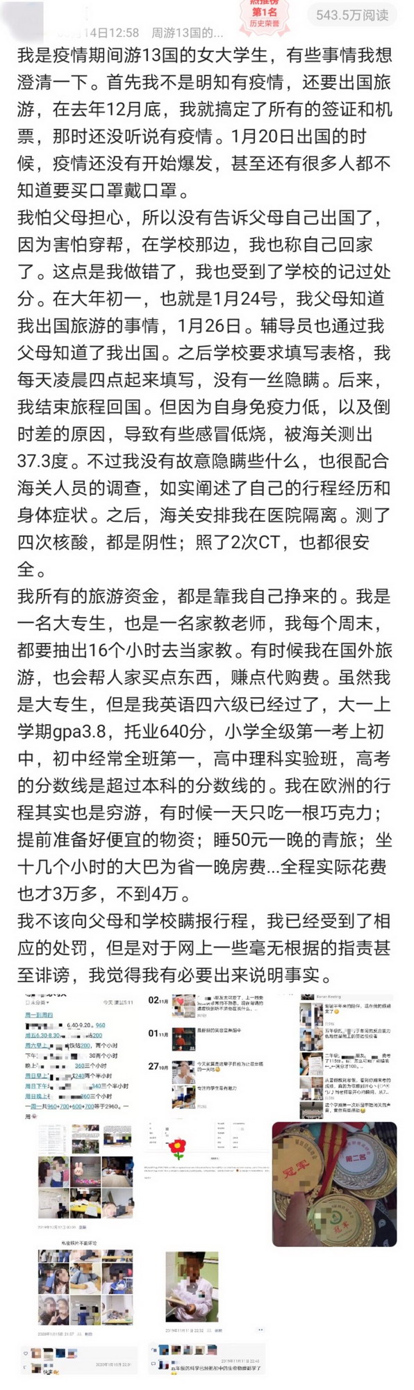 記者從小Y處了解到,1月20日,她出發(fā)開始旅行并于3月3日從珠海入境回國,期間共游玩13個國家。“10月份就已經(jīng)決定出去玩,11月一直在準(zhǔn)備簽證,12月中旬簽證什么的都已經(jīng)準(zhǔn)備好了?!庇捎诤ε赂改笓?dān)心她一人在外旅行的安全問題,出發(fā)時并沒有告知父母?!?月23日,學(xué)校要求所有學(xué)生填寫一個假期所在地,我填寫的是‘在家’,因為不想讓家里人知道我在國外,害怕穿幫。出發(fā)時國內(nèi)疫情還沒有爆發(fā),所以不是很清楚國內(nèi)的疫情,也沒想到填這個信息是為了防控疫情所用,所以沒有如實填寫。大年初一,也就是1月24日,我父母知道了我出國的事,對我嚴(yán)厲批評。之后學(xué)校要求填寫表格,我沒有隱瞞,都是如實填寫?!?/p>
