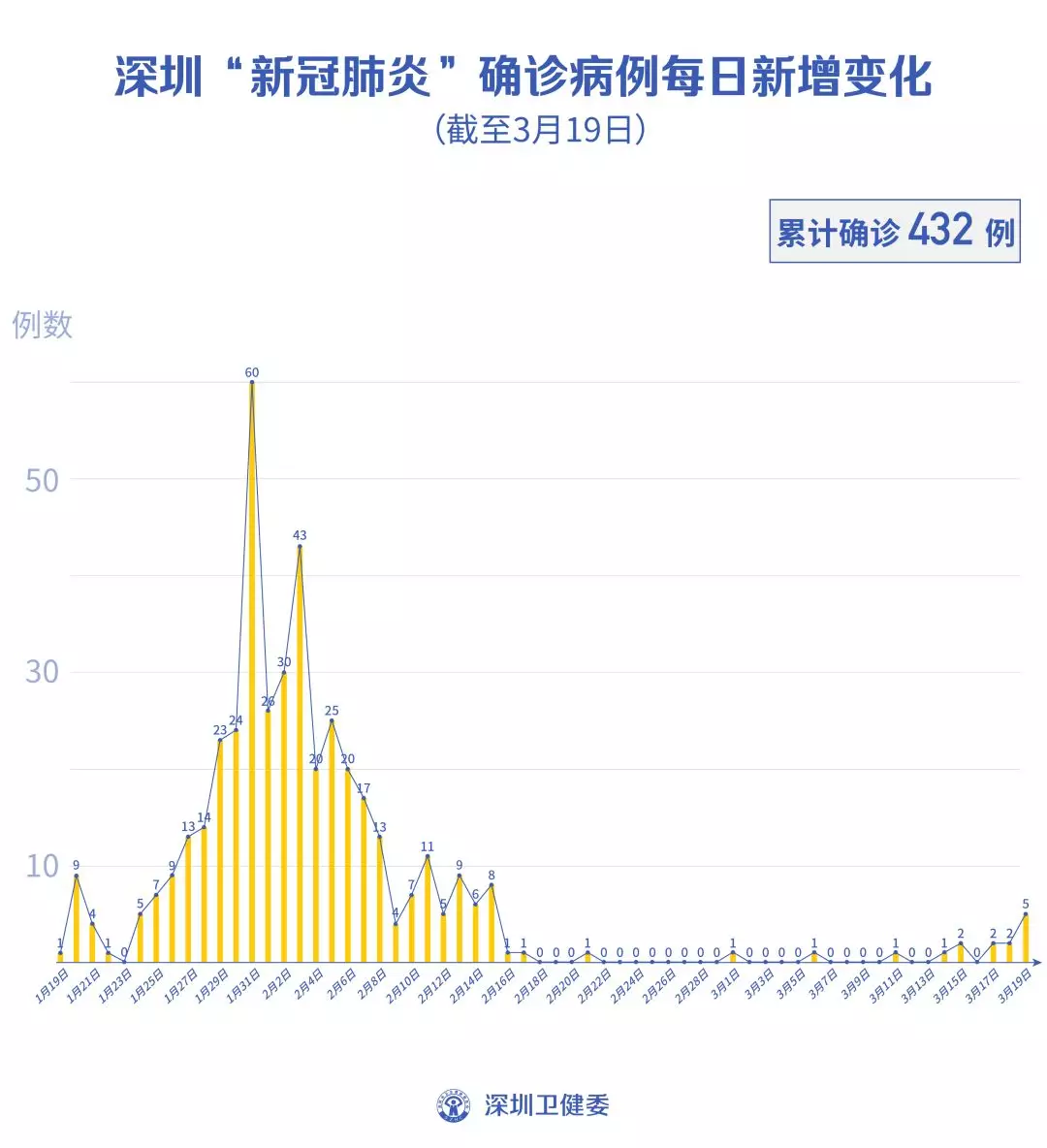 截至3月19日24時,深圳累計報告“新冠肺炎”病例432例。3月19日當(dāng)天新增5例,出院2例。