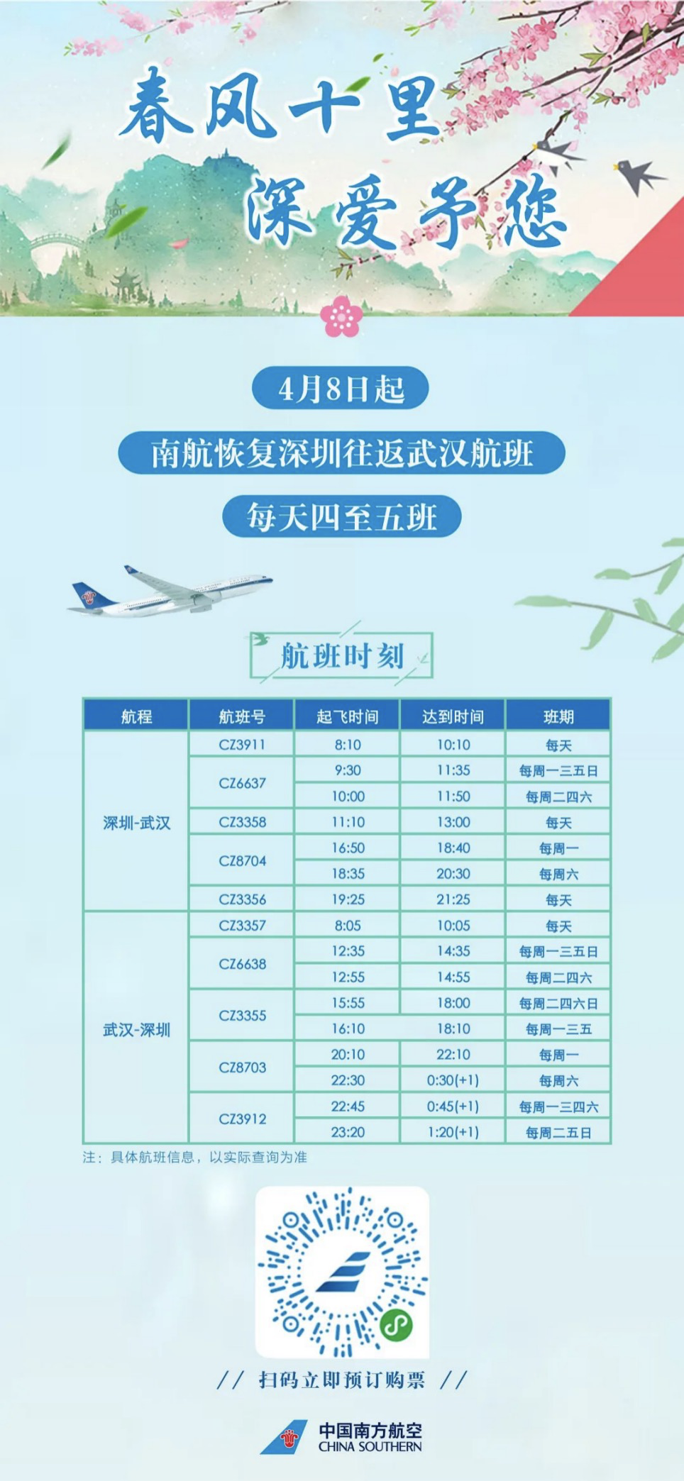 原標題:4月8日起南航恢復深圳往返武漢航班