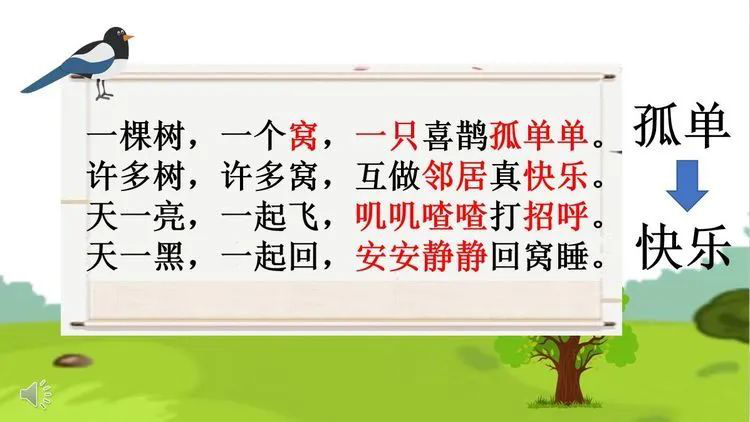 在劉老師的課堂上,她帶來《樹和喜鵲》故事中主人公小喜鵲日記本獎(jiǎng)勵(lì)讀書流利、情感充沛的孩子們。通過小喜鵲的日記,婉儀老師將課堂成功地轉(zhuǎn)接到課文的文本當(dāng)中。進(jìn)而有對(duì)文章中出現(xiàn)的事物、事物所具備的特點(diǎn)展開了細(xì)致而有趣的學(xué)習(xí)。期間,婉儀老師還化身小記者,用三段對(duì)于自己學(xué)生的采訪視頻,讓學(xué)生對(duì)于“孤單”二字有了更加深刻的理解。