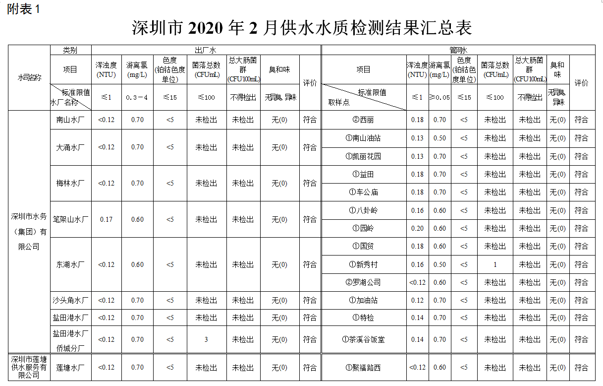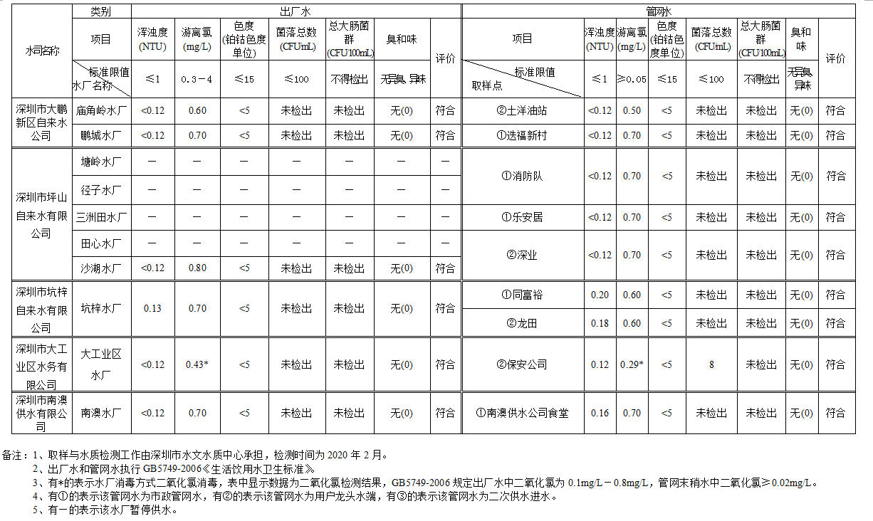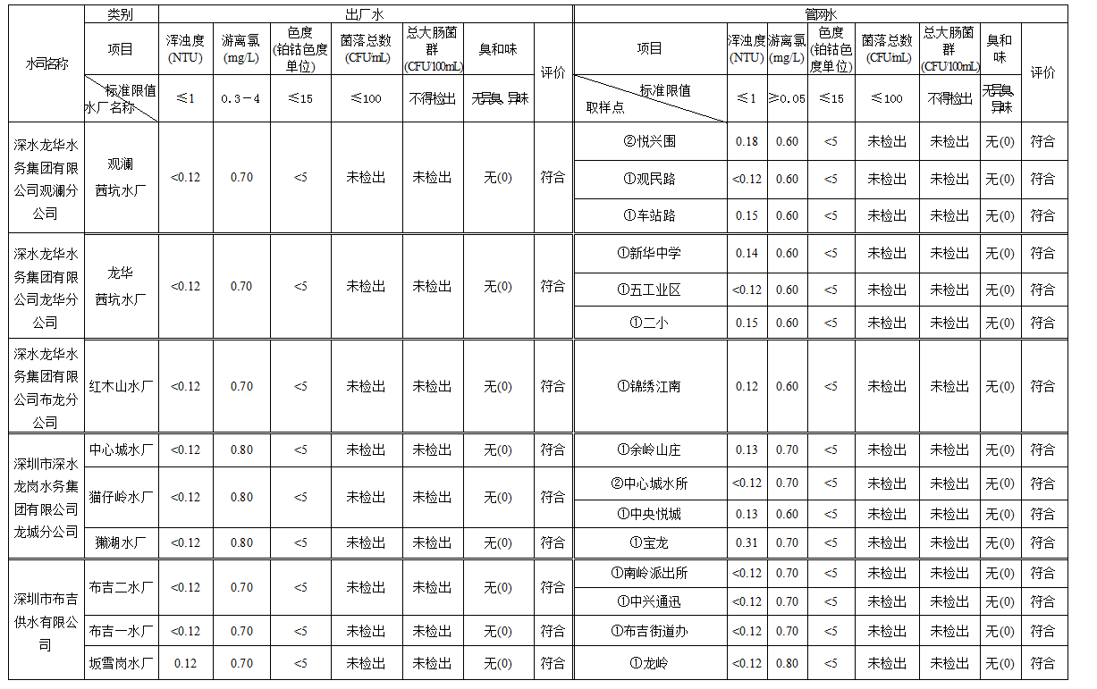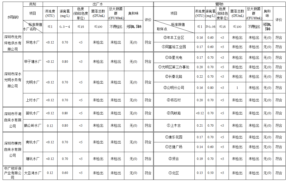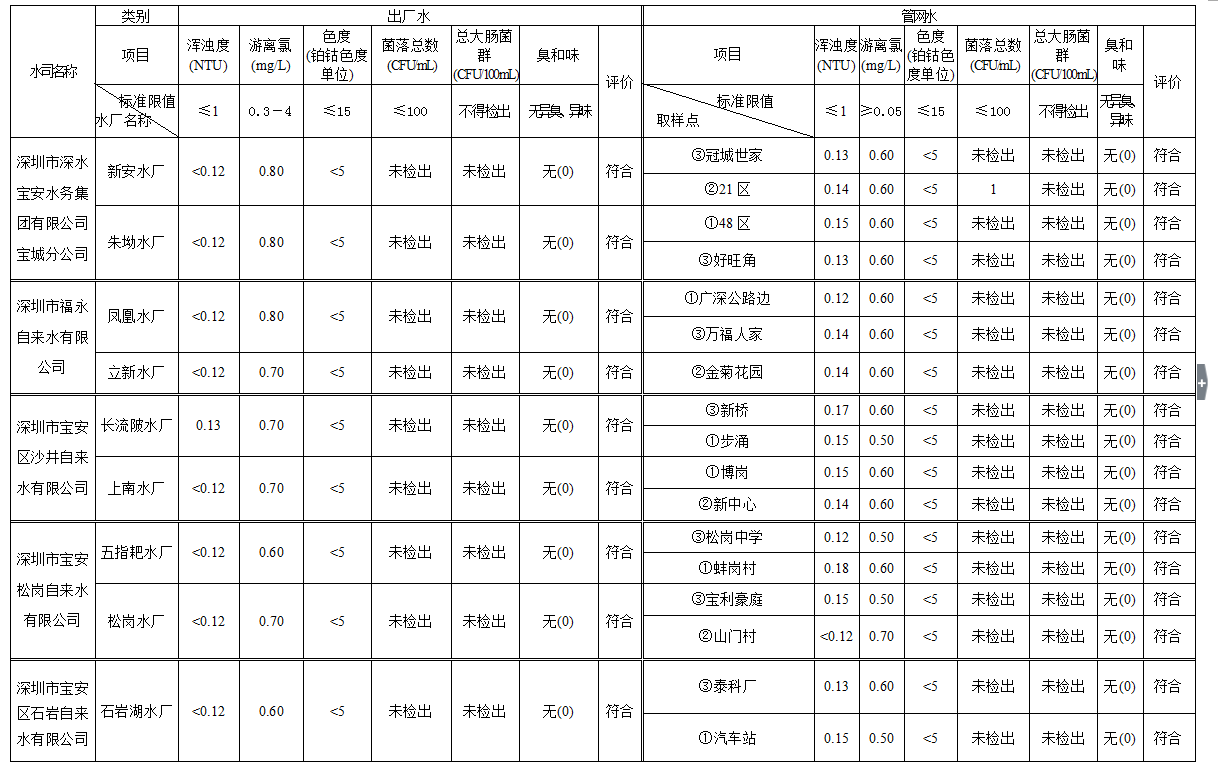 見圳客戶端·深圳新聞網(wǎng)2020年4月4日訊(見圳客戶端、深圳新聞網(wǎng)記者葉梅)2020年2月,深圳市水務(wù)局對全市42個(gè)水廠出廠水水樣以及68個(gè)管網(wǎng)水水樣進(jìn)行了抽檢。檢測結(jié)果表明,依據(jù)GB5749—2006《生活飲用水衛(wèi)生標(biāo)準(zhǔn)》,所有受檢42個(gè)出廠水水樣和68個(gè)管網(wǎng)水水樣的渾濁度、消毒劑(游離氯或二氧化氯或總氯)、色度、菌落總數(shù)、總大腸菌群及臭和味共6項(xiàng)常規(guī)指標(biāo)全部符合該標(biāo)準(zhǔn)的規(guī)定,出廠水水樣合格率為100%,管網(wǎng)水合格率為100%。