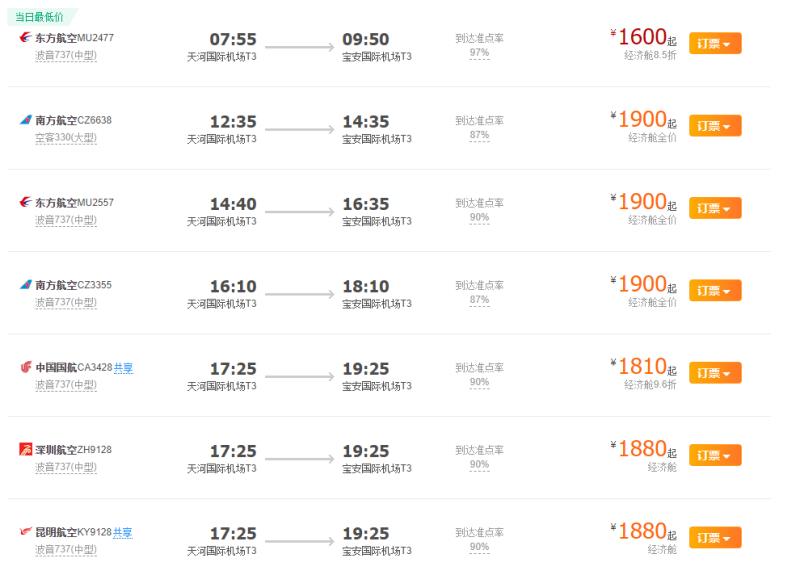 旅游app查詢到的當日武漢飛深圳航班情況。