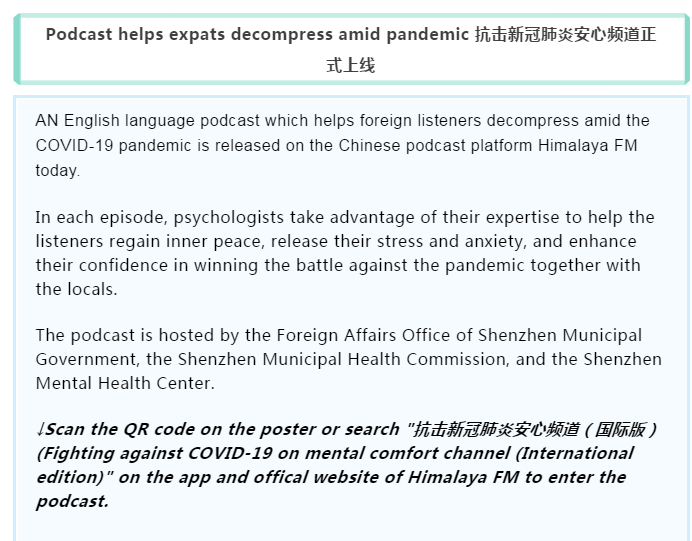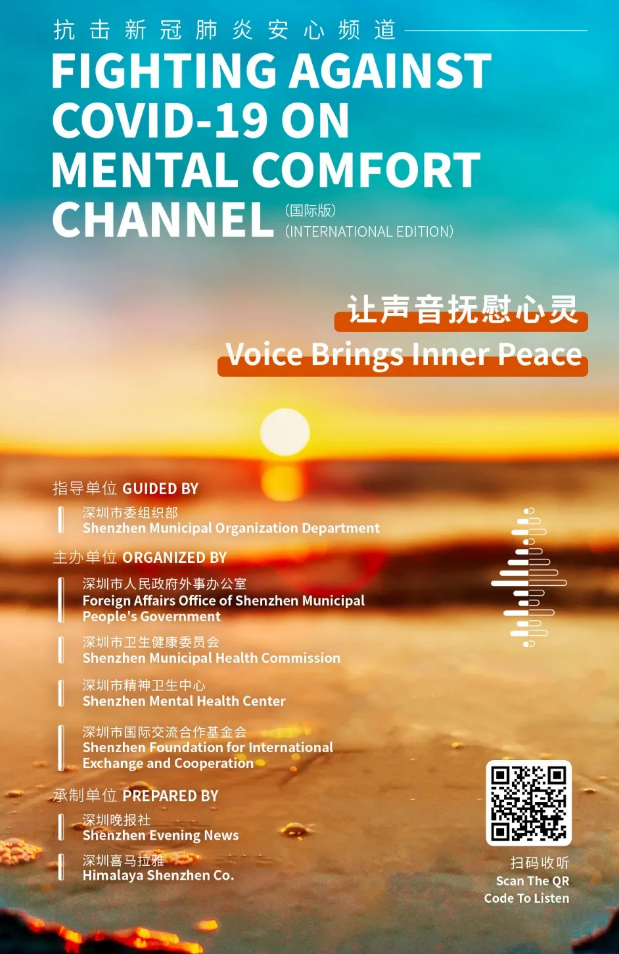 在疫情面前,每一份信念都意義重大,每一個(gè)希望都影響深遠(yuǎn)。4月11日,抗擊新冠肺炎安心頻道(國(guó)際版)在喜馬拉雅 APP正式上線。該欄目在深圳市委組織部的指導(dǎo)下,由深圳市外辦攜手深圳市衛(wèi)健委、深圳市精神衛(wèi)生中心、深圳市國(guó)際交流合作基金會(huì)聯(lián)合出品,由深圳晚報(bào)和深圳喜馬拉雅共同承制。據(jù)悉,抗擊新冠肺炎安心頻道(國(guó)際版)是深圳市外辦首次聯(lián)合多部門協(xié)作,共同出品的全英文音頻欄目,也是繼"抗擊新型肺炎安心手冊(cè)音頻版"推出以來的又一大創(chuàng)新。該欄目的推出體現(xiàn)了深圳對(duì)中外居民的人文關(guān)懷,也展現(xiàn)了深圳作為國(guó)際化城市的溫暖大愛。