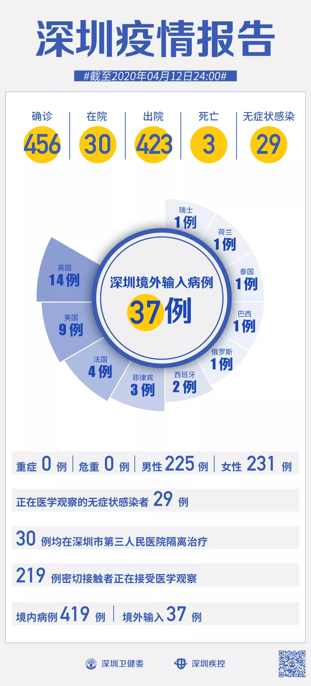 截至4月12日24時(shí),深圳累計(jì)報(bào)告新冠肺炎病例456例。4月12日當(dāng)天新增無癥狀感染者1例。
