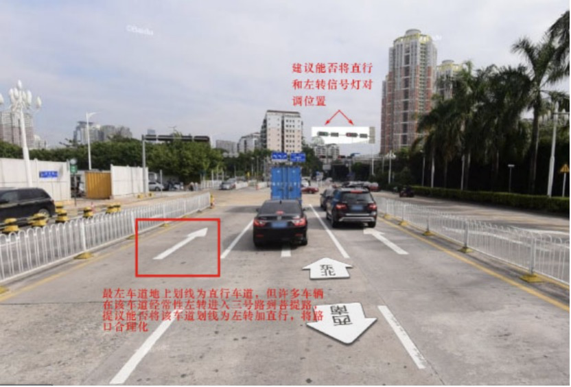 市民建議,桂花路與三號(hào)路交叉路口的直行信號(hào)燈和左轉(zhuǎn)信號(hào)燈對(duì)調(diào)位置;同時(shí),桂花路此處的直行最左側(cè)車道可改為左轉(zhuǎn)加直行標(biāo)識(shí)。這樣既可以方便社會(huì)車輛在此左轉(zhuǎn),又避免有些駕駛員因?yàn)闆]注意到左轉(zhuǎn)信號(hào)燈而隨直行車輛左轉(zhuǎn)造成的堵塞或交通事故。