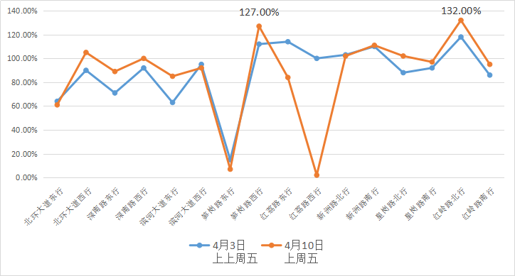 同時,主干道的飽和程度也處于高位。經(jīng)對上周五和上上周五晚高峰各主干道飽和度情況分析,筍崗路西行和紅嶺路北行飽和度最高,超過120%。預(yù)計本周五各主干道飽和度,依然維持較高狀態(tài)。