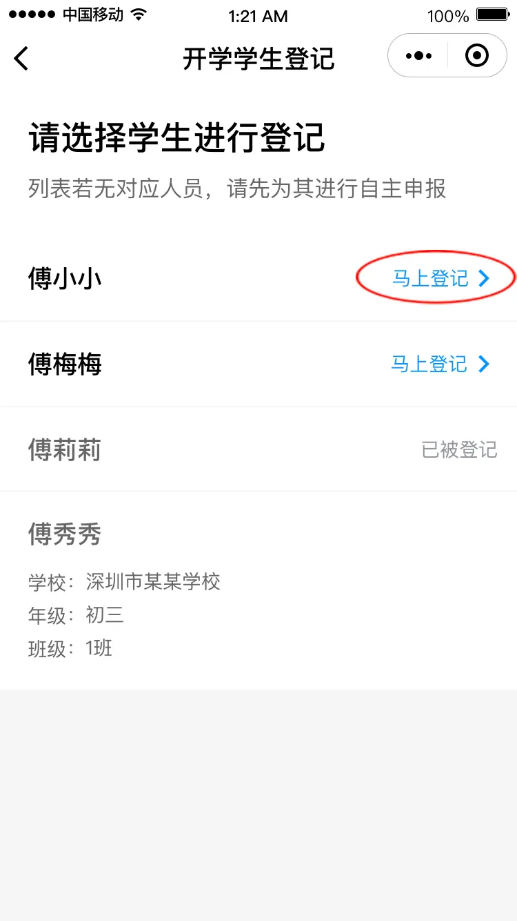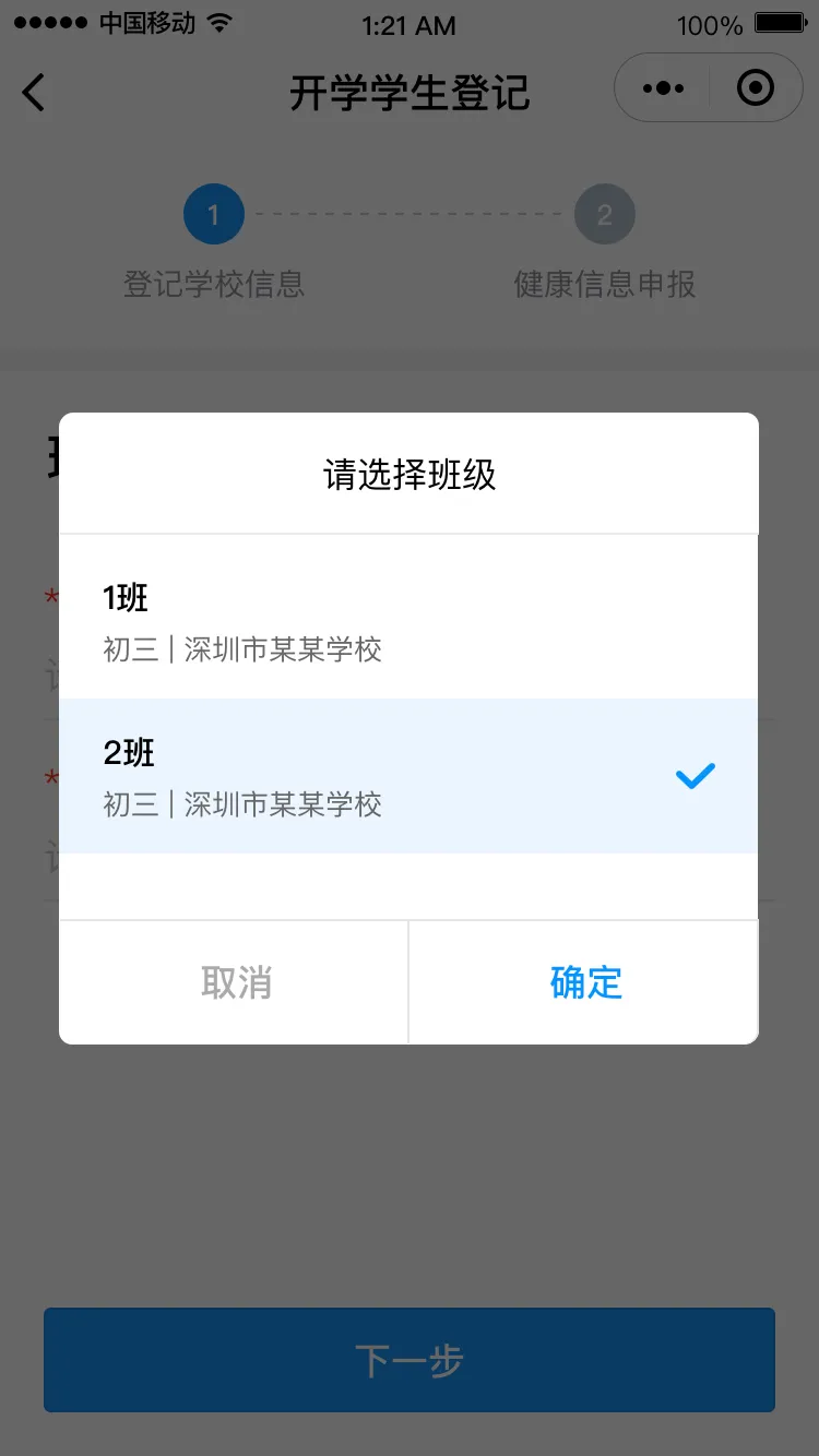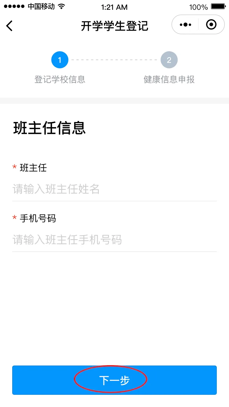 進入“開學(xué)學(xué)生登記”頁面,點擊“馬上登記”進入登記界面,填寫班主任姓名和手機號碼后點擊“下一步”,請選擇對應(yīng)的班級,進入健康申報卡界面。