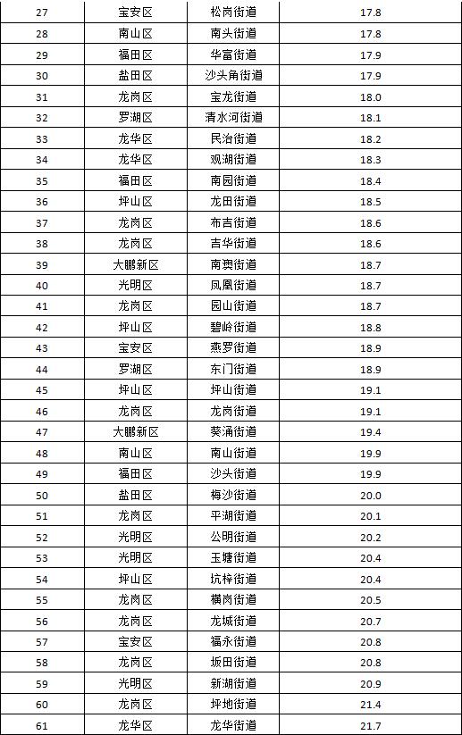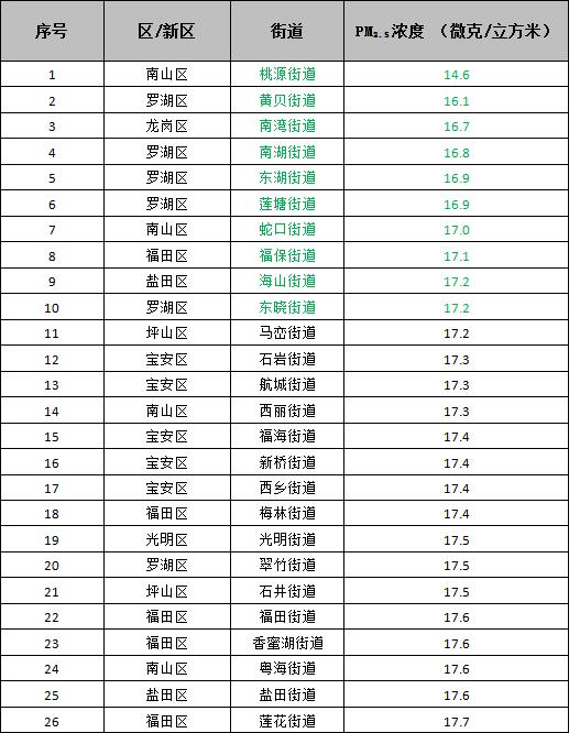 空氣質(zhì)量排名前十的街道是:桃源街道、黃貝街道、南灣街道、南湖街道、東湖街道、蓮塘街道、蛇口街道、福保街道、海山街道和東曉街道;空氣質(zhì)量排名倒數(shù)十位的街道是:馬田街道、新安街道、觀瀾街道、筍崗街道、園嶺街道、福城街道、沙井街道、沙河街道、華強北街道和大浪街道。