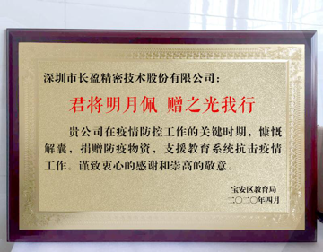 “君將明月佩,贈(zèng)之光我行”,接收物資后,寶安區(qū)教育局為長盈精密公司贈(zèng)送題詞牌匾,以表示對該公司在防疫關(guān)鍵時(shí)期慷慨解囊,支援教育系統(tǒng)抗擊疫情工作的感謝和敬意。