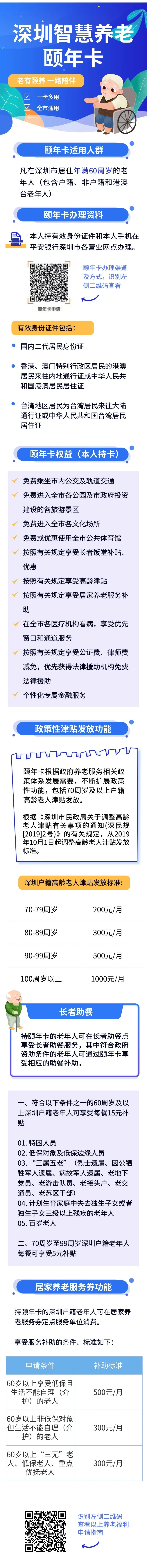 據(jù)悉,凡在深圳市居住年滿60周歲以上的老年人(包含港澳臺老年人),均可持有效身份證件和手機(jī)申請辦理?!邦U年卡”持卡人,可享受敬老優(yōu)待,包括免費(fèi)進(jìn)入全市各公園,免費(fèi)進(jìn)入市政府投資建設(shè)各旅游景區(qū),免費(fèi)乘坐市內(nèi)公交車和軌道交通。70周歲及以上戶籍老人還可享受高齡津貼發(fā)放;符合規(guī)定的戶籍老年人可享受居家養(yǎng)老消費(fèi)的優(yōu)惠和補(bǔ)貼,包括:生活照料、家政服務(wù)、康復(fù)護(hù)理服務(wù)、日托服務(wù)、心理咨詢等。
