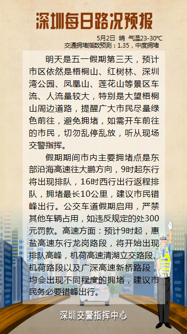 由于市民出行意愿較強烈,預(yù)計明日市內(nèi)熱門商圈、景區(qū)、公園的車流量壓力仍較大,大鵬、鹽田等濱海景區(qū)車流量將會持續(xù)增加。