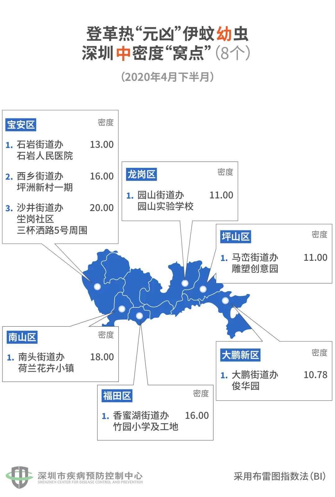 據(jù)悉,在全市設(shè)置的423個(gè)監(jiān)測點(diǎn)中,不合格的有104個(gè),占24.59%。其中低密度有79個(gè),中密度有20個(gè),高密度有5個(gè)。5個(gè)“蚊子窩”全在寶安!