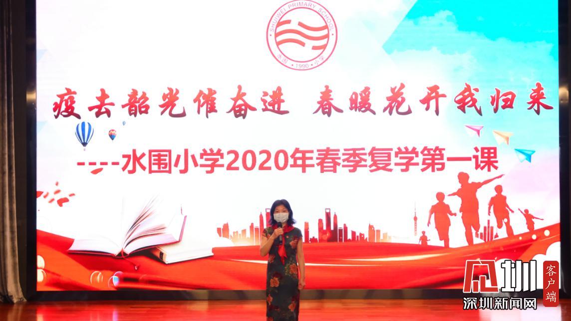 據(jù)悉,水圍小學(xué)“復(fù)學(xué)典禮”上午8:40正式開始,出席的嘉賓有福田區(qū)教科院教研員、少先隊(duì)總輔導(dǎo)員李楠、衛(wèi)生健康副校長(zhǎng)明昭。各班級(jí)的學(xué)生則帶著口罩,單人單桌在教室內(nèi),以觀看直播的方式參加典禮。