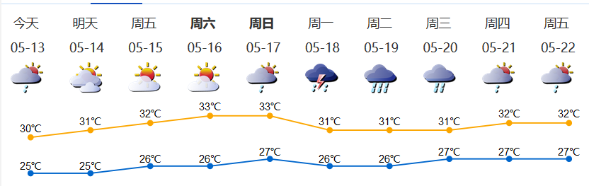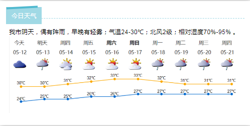 我市陰天間多云,有分散陣雨;氣溫25-30℃;東風(fēng)2-3級(jí);相對(duì)濕度65%-95%。