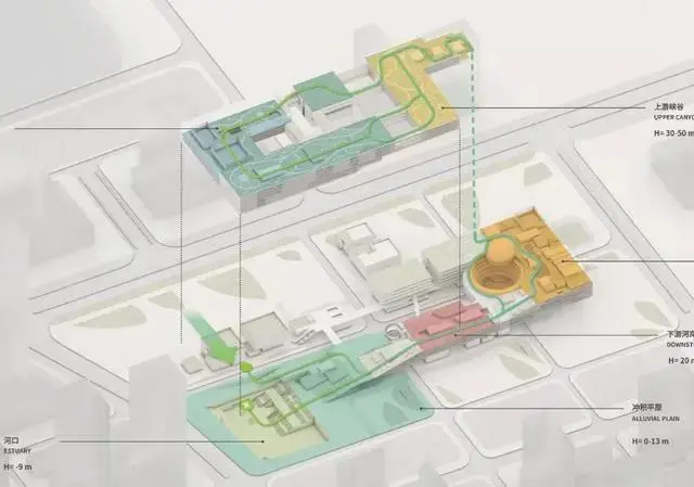 產(chǎn)業(yè)生態(tài)雨林的三個層級都可經(jīng)由一個城市公園的多層級通道系統(tǒng)抵達,仿佛曲折蜿蜒的河水流過緩坡。