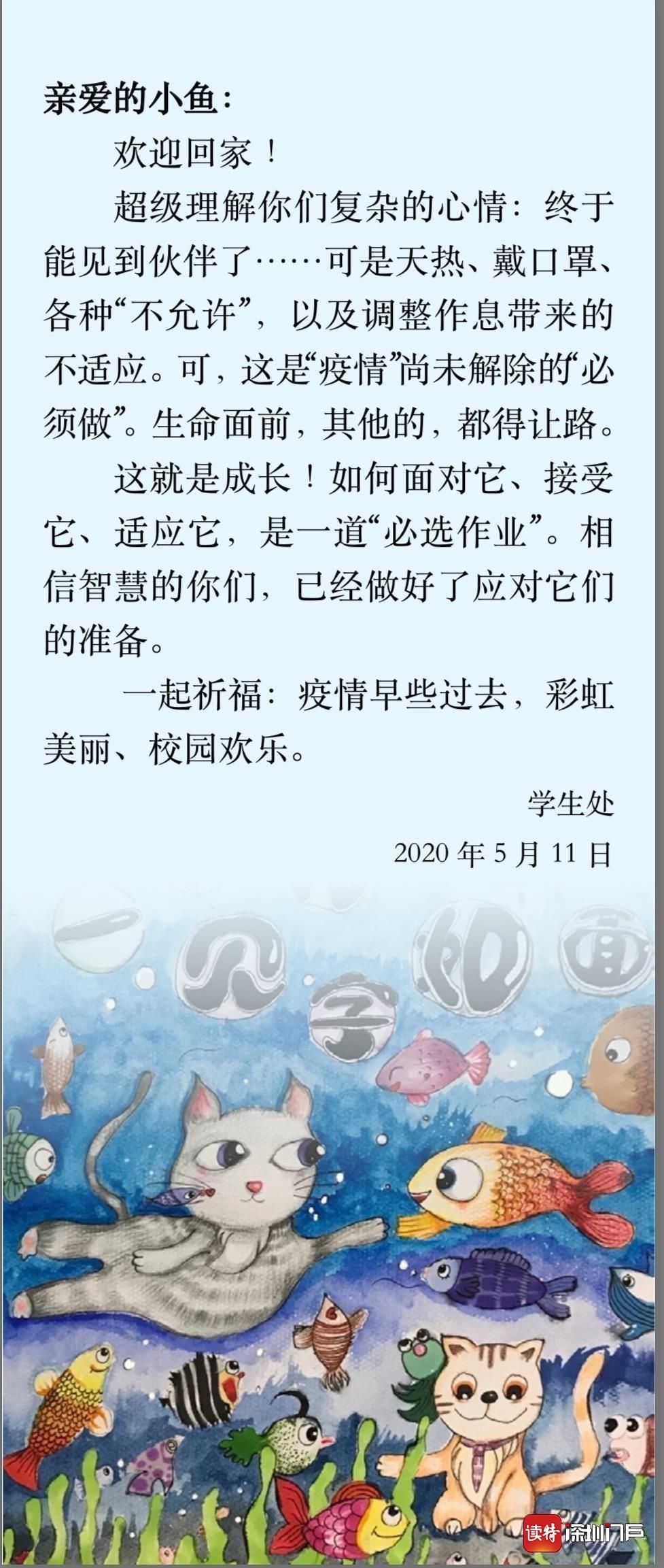 今日,翠北實驗小學(xué)1-3年級共有960名學(xué)生返學(xué)。學(xué)校為學(xué)生提供了“翠北五樣”小禮包,里面裝有雨衣、備用口罩、手帕、抹布和水杯。此外,學(xué)校還為學(xué)生設(shè)計準(zhǔn)備了“萌版書簽”,上面有具體自我防護(hù)要求。老貓校長做復(fù)課講話后,到班級鼓勵小魚“老貓想你們了”。(讀特記者焦子宇)