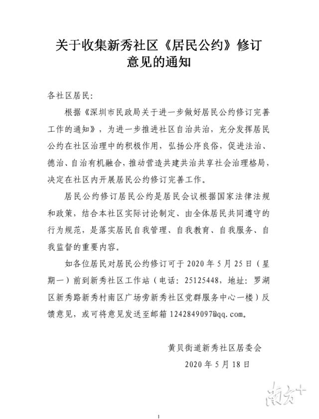 南方網(wǎng)2020年5月18日訊 垃圾分類(lèi)、文明養(yǎng)犬、廣場(chǎng)舞不擾民……近日,一則社區(qū)居民公約征求意見(jiàn)稿貼在了深圳羅湖黃貝街道新秀社區(qū)的公告欄,成為居民們談?wù)摰臒衢T(mén)話題。