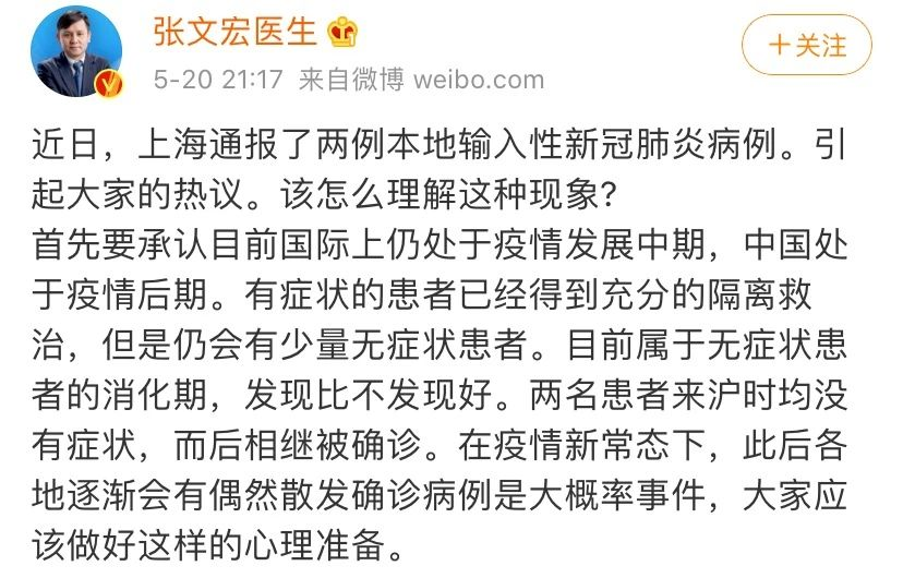 近日,上海通報(bào)了兩例本地輸入性新冠肺炎病例。20日晚間,上海新冠肺炎醫(yī)療救治組組長、復(fù)旦大學(xué)附屬華山醫(yī)院感染科主任張文宏發(fā)布微博稱,兩名患者來滬時(shí)均沒有癥狀,而后相繼被確診。