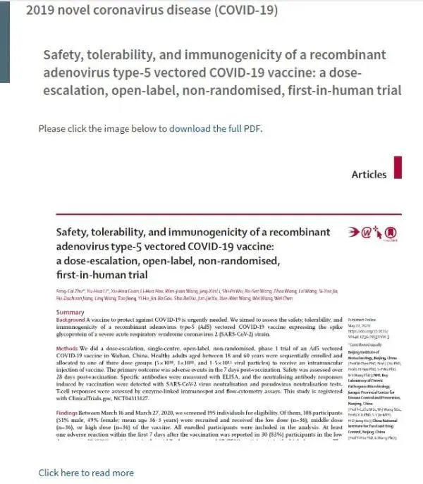 柳葉刀發(fā)布陳薇團(tuán)隊疫苗試驗(yàn)結(jié)果: