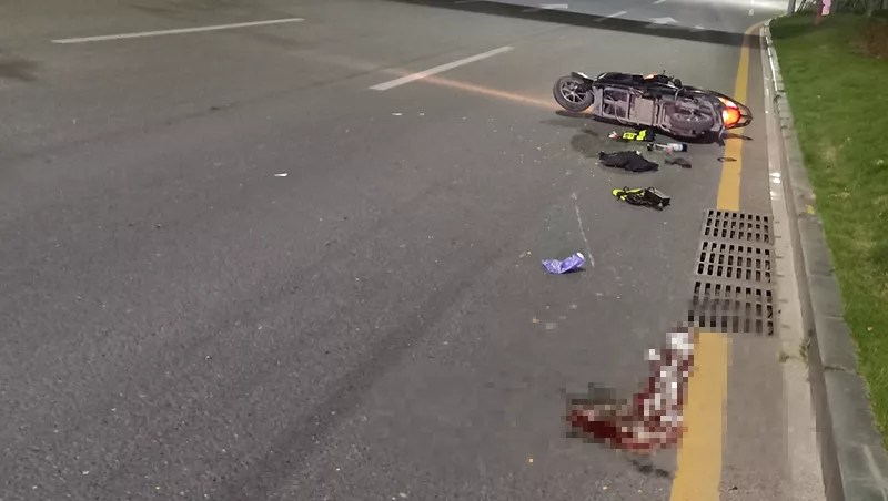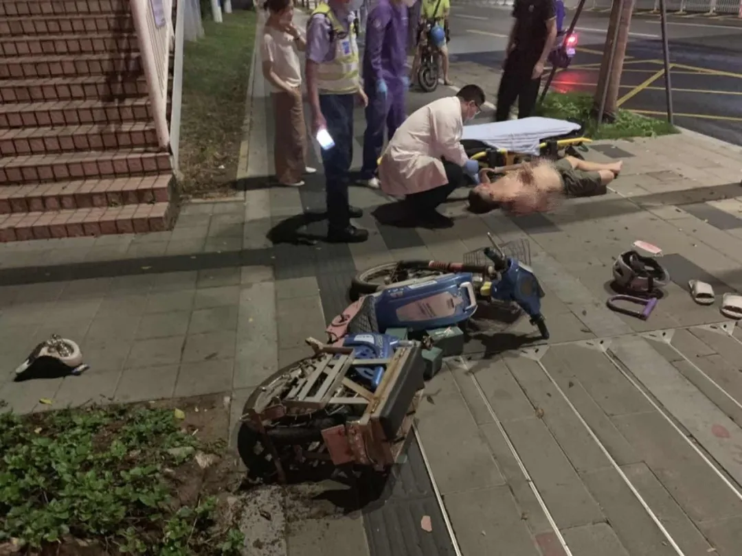 該男子上半身裸露橫躺在人行道上,而且臉上、身上多處擦傷,右眼淤青紅腫,旁邊還有一輛損壞的兩輪電動(dòng)車,坐墊、鎖鏈、頭盔散落一地。
