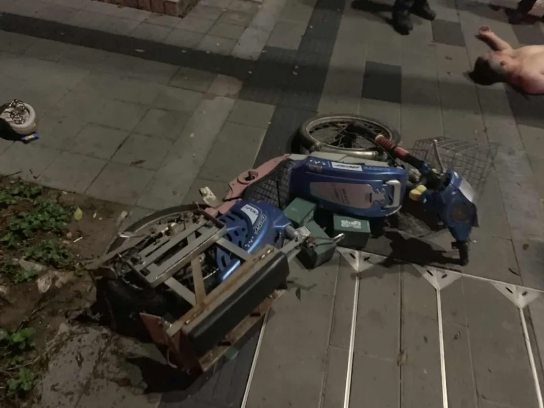 該男子上半身裸露橫躺在人行道上,而且臉上、身上多處擦傷,右眼淤青紅腫,旁邊還有一輛損壞的兩輪電動(dòng)車,坐墊、鎖鏈、頭盔散落一地。