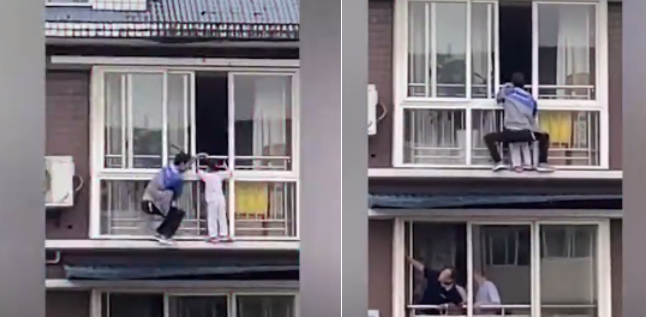5月21日,四川富順縣一個5歲女童翻出6樓窗外,居民趕緊在樓下?lián)纹鸨蛔?,路過的小伙胡云川則從5樓陽臺爬到6樓把孩子塞回屋內(nèi)。