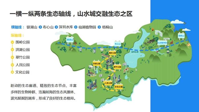 從橫軸線看羅湖,有銀湖山—布心山—深圳水庫—仙湖植物園—梧桐山;從縱軸線看羅湖,有圍嶺公園—洪湖公園—翠竹公園—人民公園—文化公園。躍動的生態(tài)廊道、精致的生態(tài)節(jié)點、豐富多樣的生物種群、浩瀚如海的生態(tài)風景林、波光粼粼的湖庫,形成了良好的生態(tài)格局。