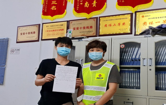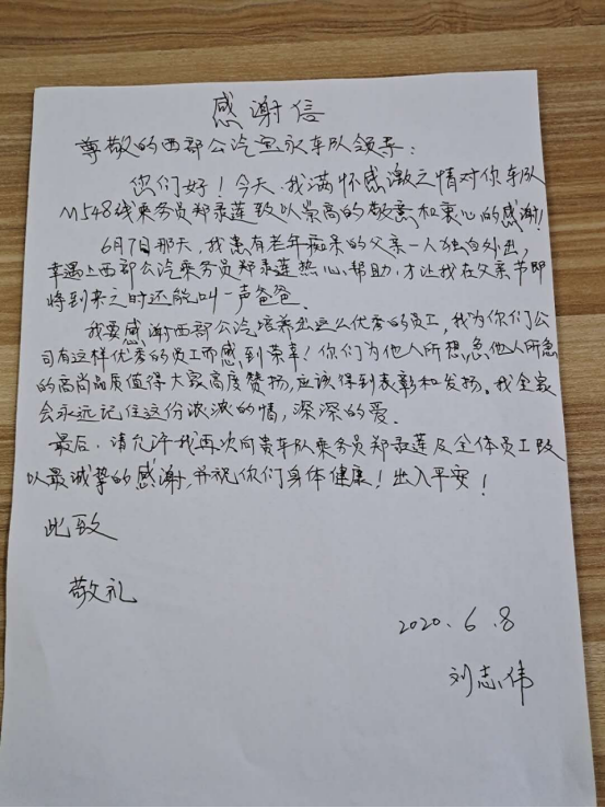 見圳客戶端·深圳新聞網(wǎng)2020年6月9日訊(深圳特區(qū)報記者 徐興東)6月9日早上,一位自稱劉先生的年輕人冒著滂沱大雨來到了西部公汽寶永車隊。一進辦公室,劉先生雙手捧著將親筆寫的一封感謝信呈給了隊助張喜鳳,并深有感觸地說道:“多災多難的父親有幸遇到乘務員鄭錄蓮的熱心幫助,并想方設法聯(lián)系上我。謝謝你們的成全,才讓我在父親節(jié)即將到來之時還能叫一聲爸爸,我將終生銘記諸位的大恩大德!”樸實無華的話語,感染了在場的每一個人,分明看出個個眼里都閃爍著晶瑩的喜悅淚花。