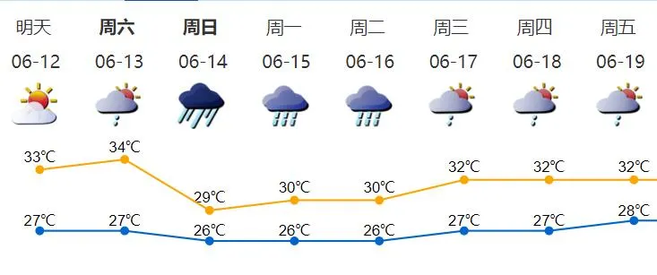 12-13日多云,偶有短時(雷)陣雨,天氣炎熱;14-15日有一次明顯風雨過程;16日仍有明顯降雨;17-18日多云,有陣雨或雷陣雨。