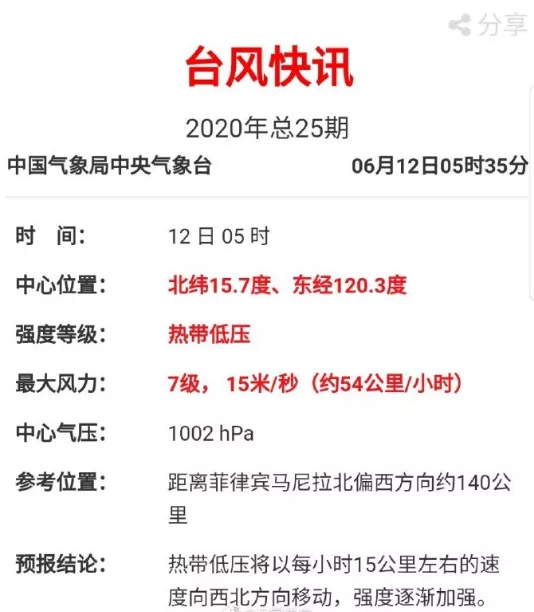 據(jù)@中央氣象臺(tái),目前位于菲律賓呂宋島西部熱帶低壓即將移入南海東部海面,強(qiáng)度逐漸增強(qiáng),12小時(shí)內(nèi)將發(fā)展成為今年第2號(hào)臺(tái)風(fēng)鸚鵡,并將于14日白天在廣東西部一帶沿海登陸(23-28米/秒,熱帶風(fēng)暴級(jí)或強(qiáng)熱帶風(fēng)暴級(jí)),登陸后強(qiáng)度逐漸減弱。