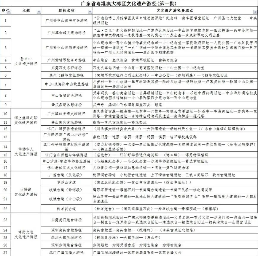 ⑦13日,首批粵港澳大灣區(qū)文化遺產(chǎn)游徑發(fā)布,包含孫中山文化遺產(chǎn)游徑、海上絲綢之路文化遺產(chǎn)游徑、華僑華人文化遺產(chǎn)游徑、古驛道文化遺產(chǎn)游徑和海防史跡文化遺產(chǎn)游徑五大主題共27段實(shí)體游徑。其中,海防史跡文化遺產(chǎn)游徑主要分布于東莞、深圳,包括深圳南頭古城游徑、大鵬所城游徑、赤灣炮臺游徑等。