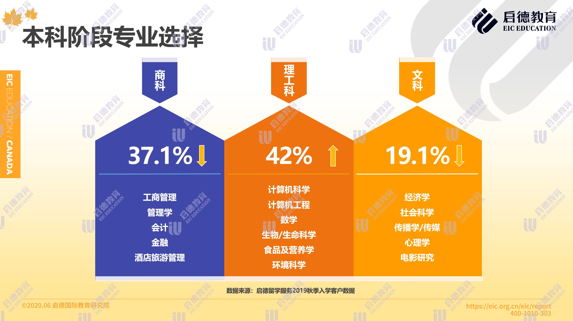 啟德留學(xué)服務(wù)2019秋季入學(xué)客戶數(shù)據(jù)顯示,在本科階段專業(yè)選擇理工科占比42%,商科占比37.1 %,文科19.1%,理工科的申請(qǐng)人數(shù)超過了商科。碩士階段選擇最多的專業(yè)是 MBA、教育學(xué)和計(jì)算機(jī),其他新興的跨學(xué)科專業(yè)包括滑鐵盧大學(xué)的數(shù)字科學(xué)與人工智能碩士,滑鐵盧大學(xué)的 MBET (商業(yè)、創(chuàng)業(yè)和技術(shù)專業(yè)),與麥克馬斯特大學(xué)的 MEEI (工程、創(chuàng)業(yè)與創(chuàng)新專業(yè))。