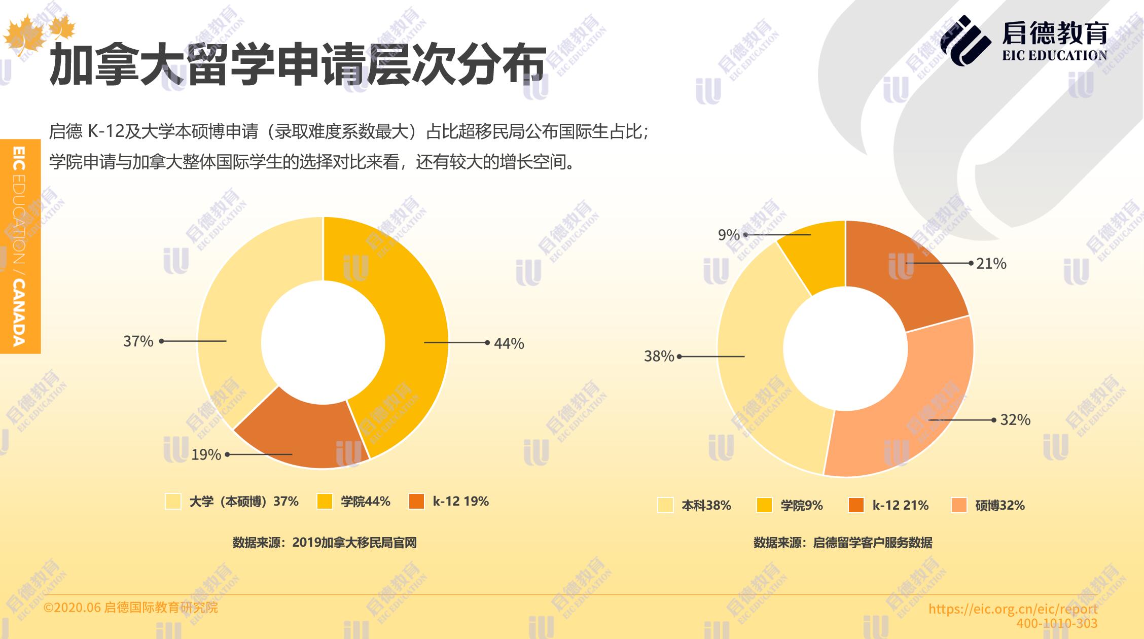加拿大移民局官網(wǎng)2019年數(shù)據(jù)顯示,加拿大國際學(xué)生中 K-12階段申請(qǐng)占比為19%,大學(xué)(本、碩、博)申請(qǐng)占比37%,學(xué)院申請(qǐng)占比44%。啟德留學(xué)客戶服務(wù)數(shù)據(jù)顯示,2019年通過啟德申請(qǐng)加拿大留學(xué)的學(xué)生中,申請(qǐng)本科與碩博的學(xué)生占比分別為38%與32%,申請(qǐng)學(xué)院的占比為9 %,申請(qǐng)中學(xué)及其它的占比為21%,與加拿大移民局的官方數(shù)據(jù)對(duì)比來看,中國學(xué)生本科留學(xué)加拿大的占比較高,且在學(xué)院類申請(qǐng)中仍有不小的增長空間。