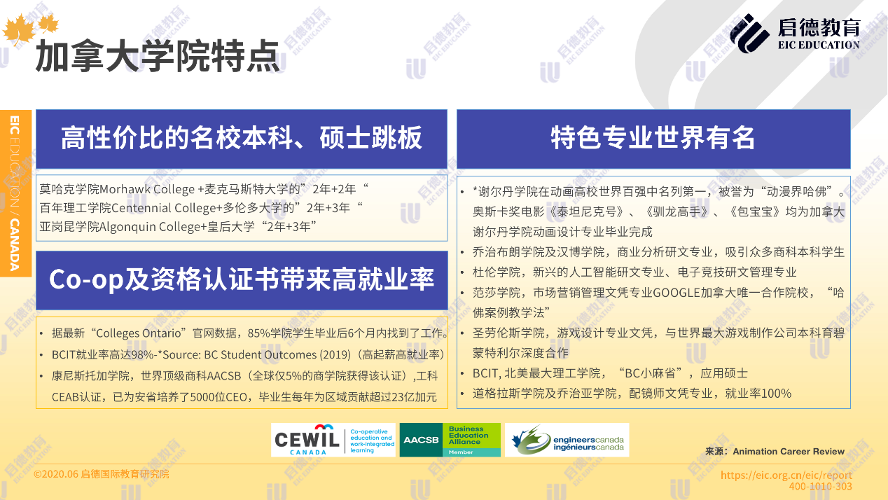 據(jù)最新“ Colleges Ontario”官網(wǎng)數(shù)據(jù),85 %的學(xué)院學(xué)生畢業(yè)后6個(gè)月內(nèi)找到了工作,91%的雇主對(duì)學(xué)生表示非常滿意。如康尼斯托加學(xué)院,擁有世界頂級(jí)商科 AACSB與工科 CEAB認(rèn)證,為安省培養(yǎng)了5000位 CEO,畢業(yè)生每年為區(qū)域貢獻(xiàn)超過23億加元。而奧斯卡獎(jiǎng)電影《泰坦尼克號(hào)》、《馴龍高手》、《包寶寶》均為加拿大謝爾丹學(xué)院動(dòng)畫設(shè)計(jì)專業(yè)畢業(yè)完成。北阿伯塔學(xué)院的納米技術(shù)專業(yè),杜倫學(xué)院的人工智能專業(yè),道格拉斯學(xué)院的配鏡師專業(yè),范莎學(xué)院的飛機(jī)維修專業(yè)也是世界有名的特色專業(yè)。