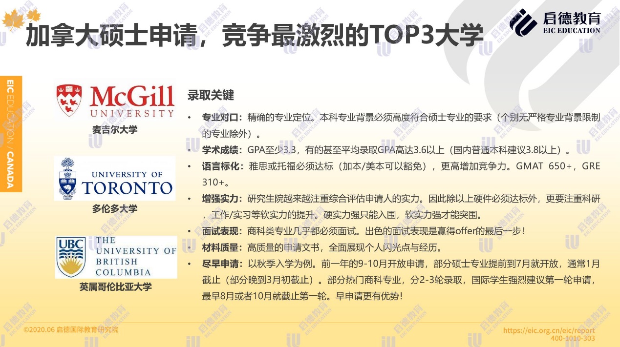 據(jù)啟德留學(xué)加拿大項(xiàng)目介紹,加拿大碩士申請(qǐng)競爭最激烈的三所大學(xué)為麥吉爾大學(xué)、多倫多大學(xué)與英屬哥倫比亞大學(xué)。申請(qǐng)人 GPA至少達(dá)到3.3,有的甚至要求平均錄取 GPA高達(dá)3.6以上(國內(nèi)普通本科建議3.8以上);雅思或托福必須達(dá)標(biāo)(加本 /美本可以豁免), GMAT650+, GRE310+;除硬件必須達(dá)標(biāo)外,加拿大名校注重科研、工作 /實(shí)習(xí)等軟實(shí)力的提升;商科類專業(yè)幾乎都必須面試。