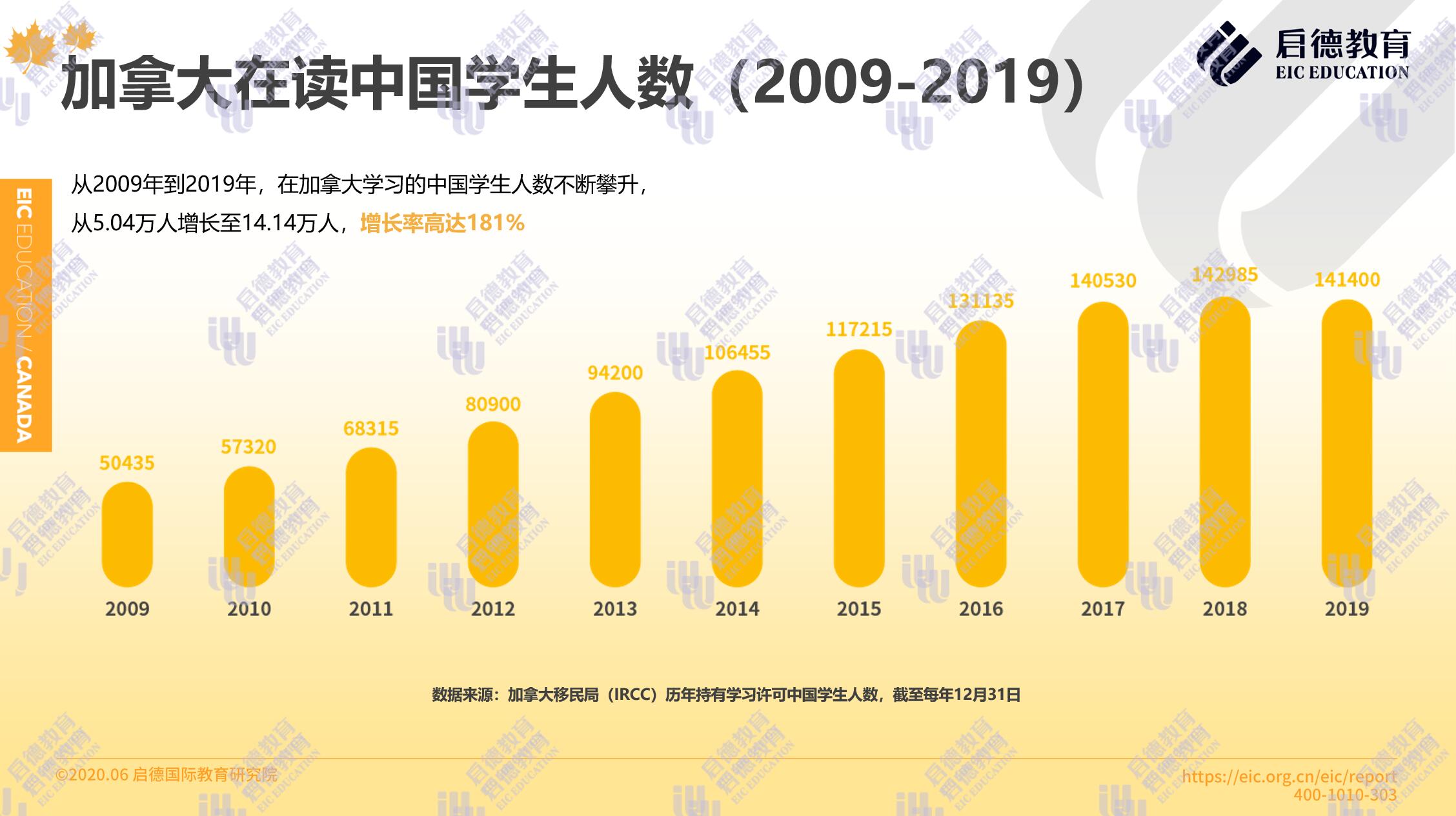 一直以來,加拿大都是中國學(xué)生四大熱門留學(xué)目的地之一。對(duì)于中國意向留學(xué)生來說,加拿大擁有教育質(zhì)量高、留學(xué)選擇靈活豐富、性價(jià)比高等優(yōu)勢。加拿大移民局( Immigration, Refugees and Citizenship Canada )公布的學(xué)習(xí)許可持有者數(shù)據(jù)顯示,2019年度約有14.14萬中國學(xué)生在加拿大留學(xué),占加拿大全部國際留學(xué)生的22.1%。中國學(xué)生人數(shù)從2009年的5.04萬人增長至2019年的14.14萬人,增長率高達(dá)181%。