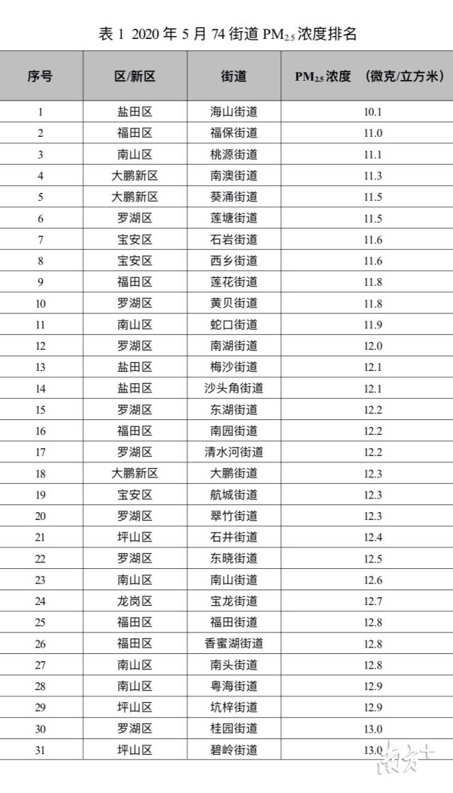 南方網2020年6月15日訊 6月15日,深圳市生態(tài)環(huán)境局向社會通報了全市74個街道5月份PM2.5濃度排名情況。海山、福保、桃源、南澳、葵涌、蓮塘、石巖、西鄉(xiāng)、蓮花和黃貝等街道名列前十。