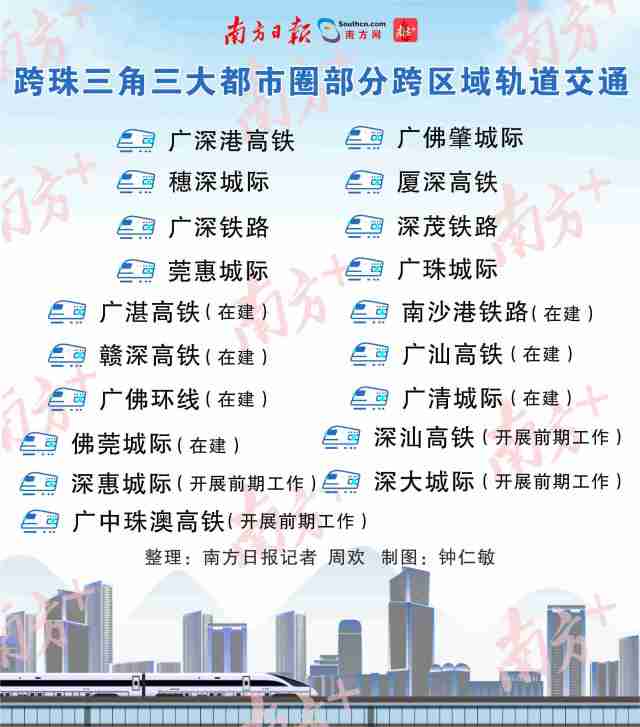廣州、深圳“CP感”滿滿,通過(guò)廣深港高鐵、穗深城際、廣深鐵路等快速互聯(lián),最快半小時(shí)互通。而廣州地鐵28號(hào)線將連接佛山、廣州、東莞,支線還擬延伸至惠州。廣州地鐵18號(hào)線則規(guī)劃深入中山、珠海。肇慶、中山、江門、佛山等也紛紛“到深圳去”……